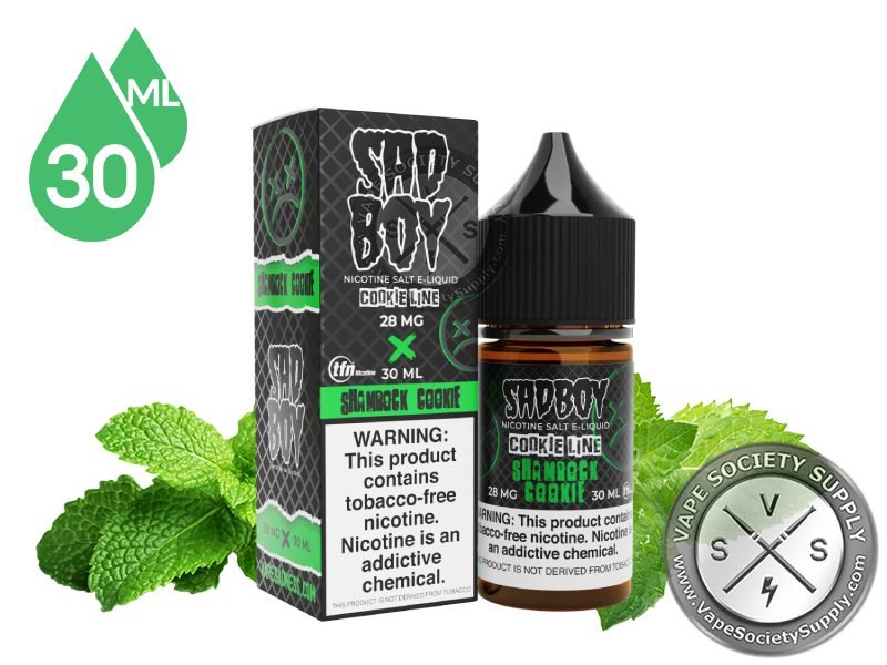 Sadboy E-Liquid Shamrock Cookie: cremosidad habitual de la galleta de mantequilla y la sumerge profundamente en el corazón de un refrescante batido de menta. La inhalación da notas de una galleta caliente horneada recién sacada del horno que se baña con menta refrescante en un batido helado durante la exhalación. Esta mezcla eJuice crea una sensación que te traerá pensamientos de clima fresco de primavera.